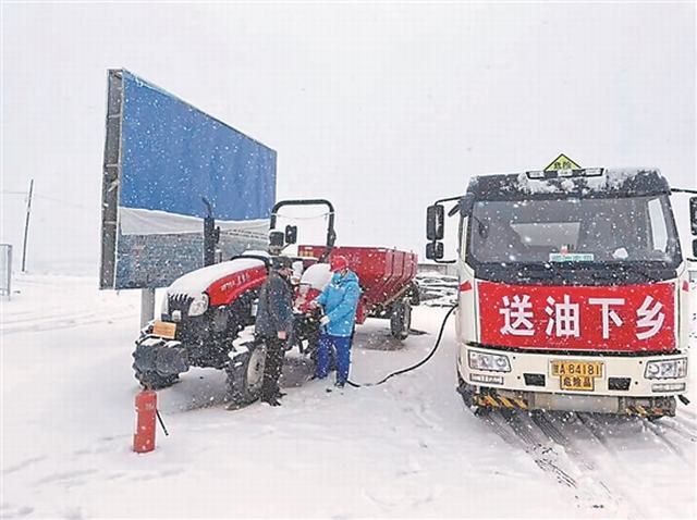 甘肃销售定西分公司员工冒雪将今年第一车春耕用油送至农户家中。(甘肃王斌)