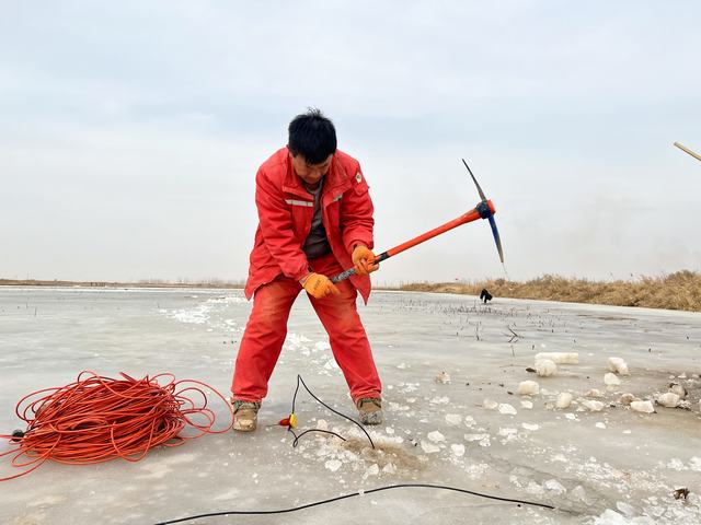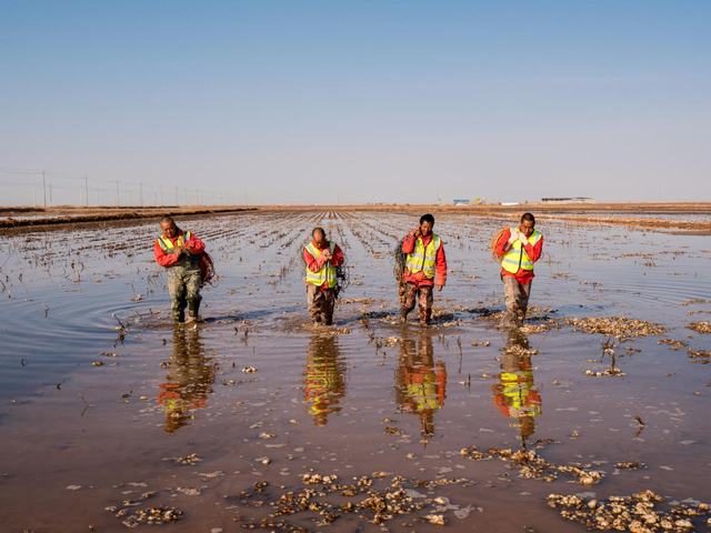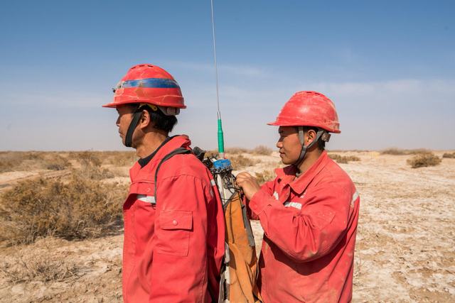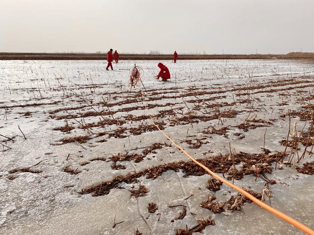 春寒料峭,乍暖还寒。在新疆库车市牙哈镇的大片棉田里,闪亮着晶莹的冰面和波光粼粼的积水,一条条橘红色的采集电缆穿越其中与勘探队员红色身影交相辉映,绘成一幅别样的物探“春耕图”。