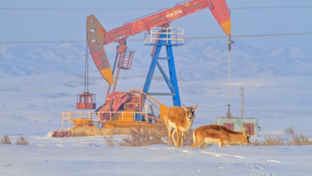 两只鹅喉羚在油区附近悠闲觅食。秦建军 摄